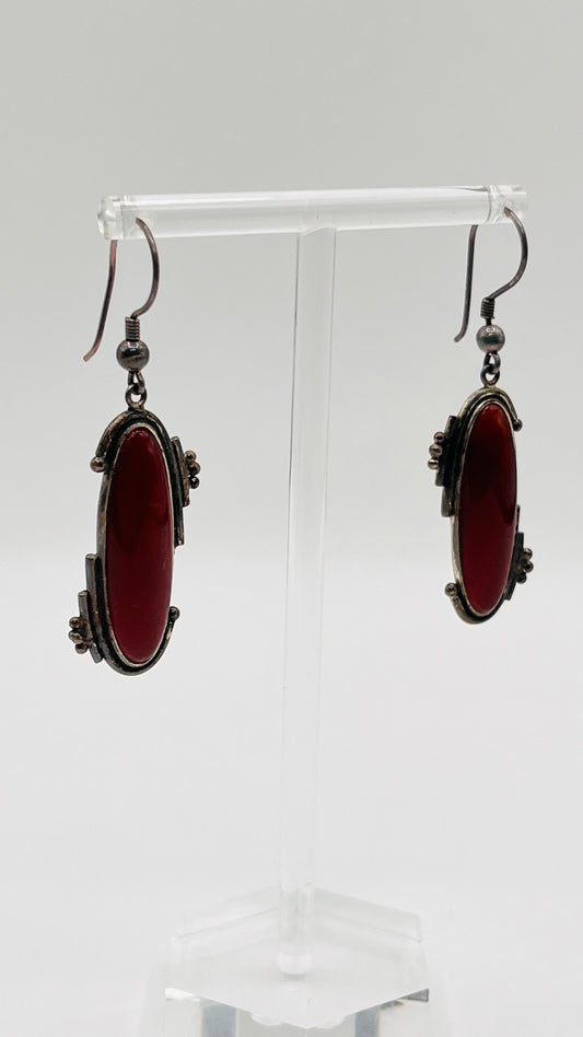 Vintage Sterling Silver 925 Dangle Hook Earrings Red Maroon Oval Carnelian Stone