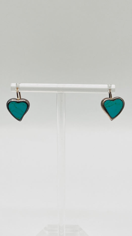 ATI Mexico 925 Sterling Silver Dangle Hook Lovely Earrings Love Heart Turquoise Inlay