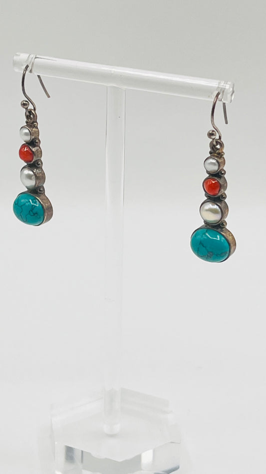 925 Sterling Silver Dangle Earrings Turquoise Coral Mother Of Pearl Navajo