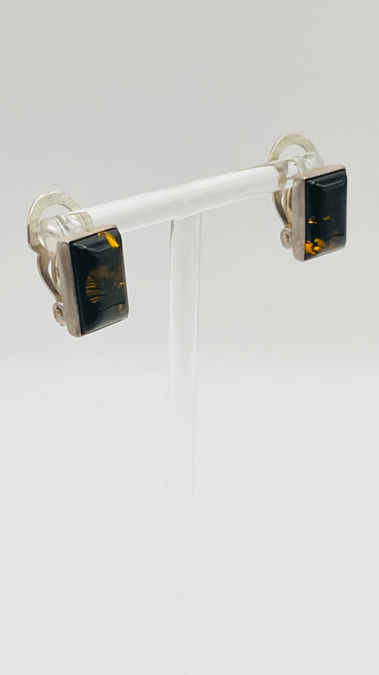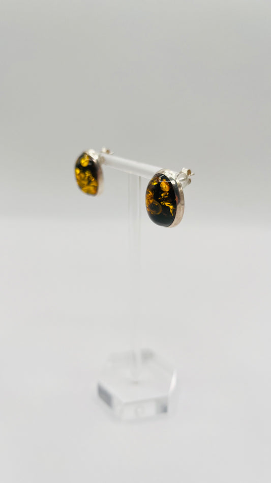 Vintage 925 Sterling Silver Earrings Green Spangle Oval Cabochon Amber Stone