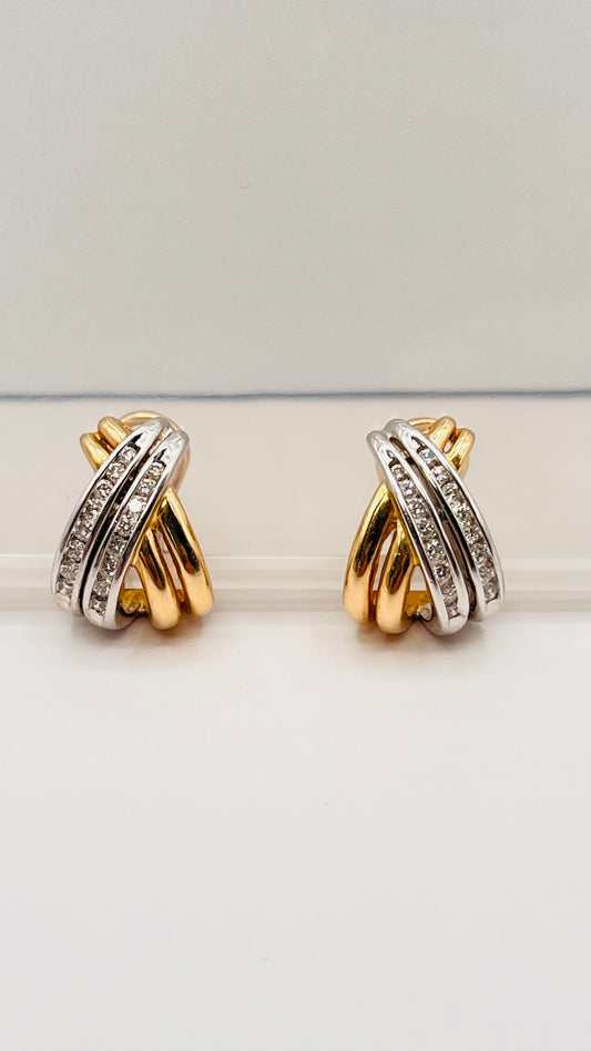 14K Yellow White Two Color Gold Diamonds Half Hoop Clip X Buddha Belly Earrings