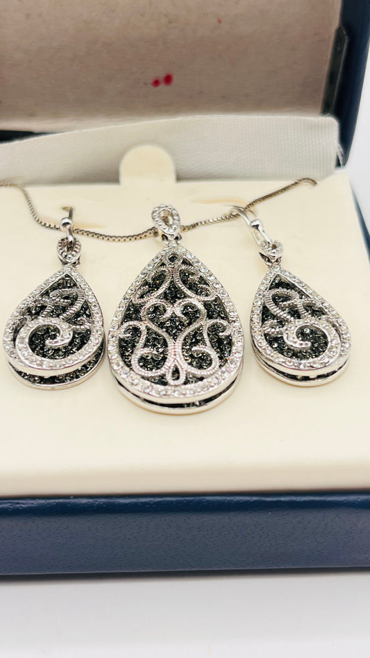 Vintage 925 Sterling Silver Teardrop Dangle Earrings Pendant Chain Necklace Set Filigree