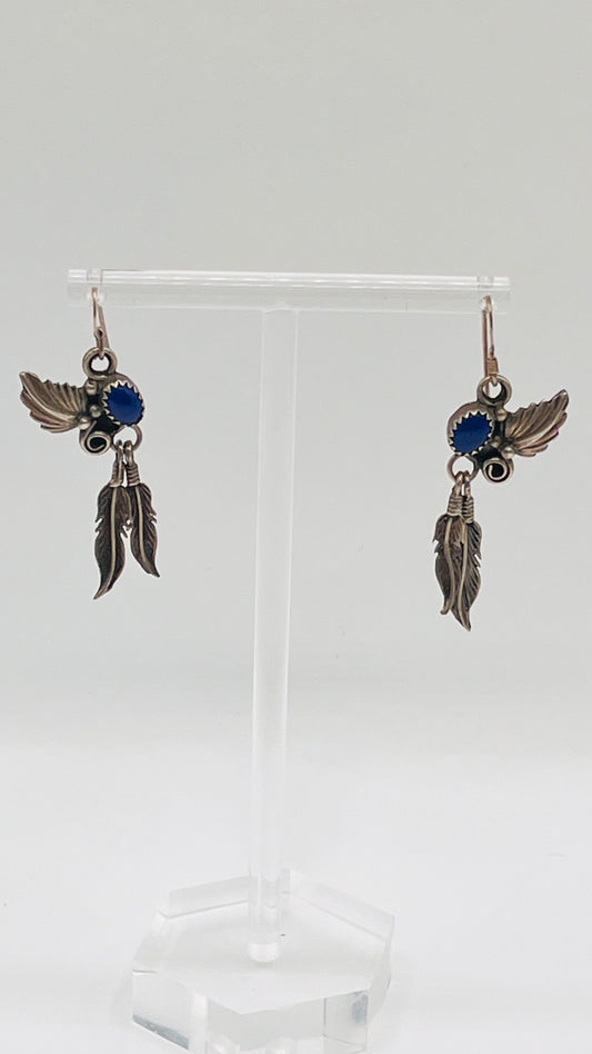 Vintage 925 Sterling Silver Dangle Hook Earrings Blue Oval Lapis Feathers Leaf