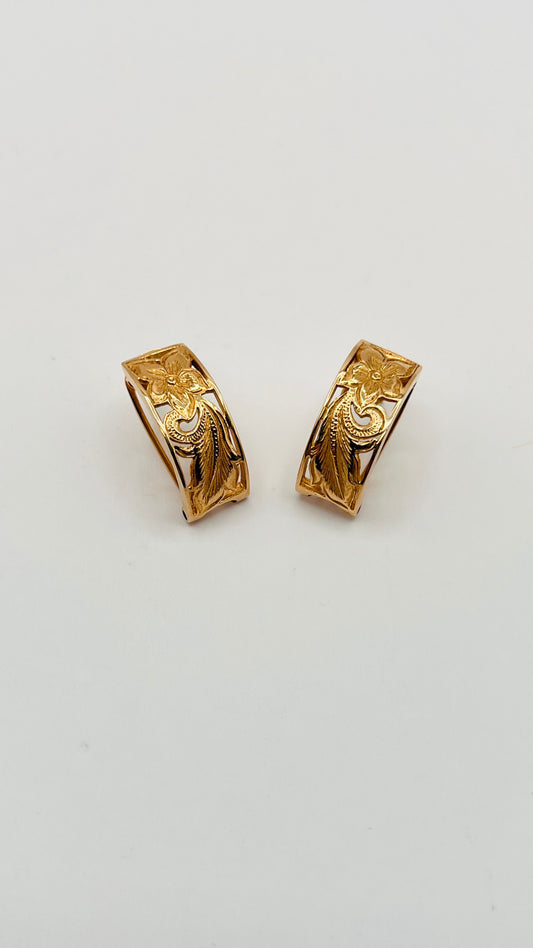 Edward Sultan Na Hoku Hawaii Floral 14K Gold Half Hoop Filigree Omega Back Earrings