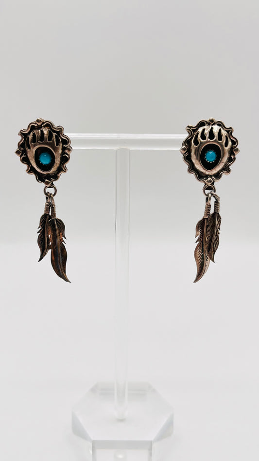 Running Bear 925 Sterling Silver Dangle Stud Earrings Turquoise Feather Navajo