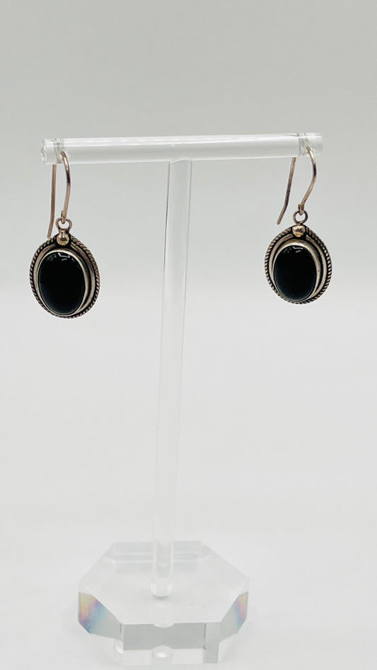 925 Sterling Silver Dangle Hook Stunning Earrings Oval Cabochon Black Onyx Twist Wire