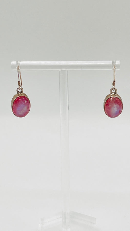 925 Sterling Silver Dangle Hook Lovely Earrings Oval Cabochon Pink Rainbow Moonstone