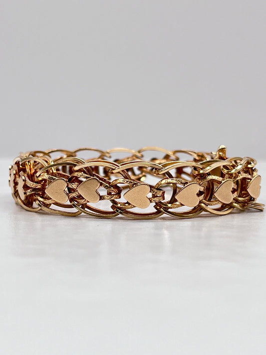 14K Solid Yellow Gold Charm Chain Linked Hearts Retro Vintage Bracelet