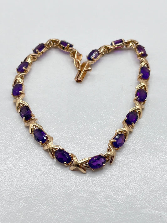 14K Solid Yellow Gold Tennis Bracelet XOXO Link Oval Purple Tanzanite Stones