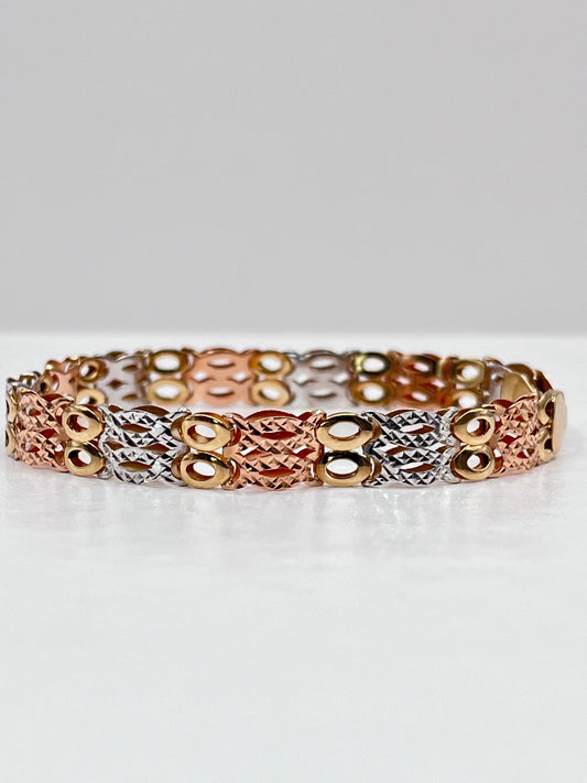 14K Solid Gold Tri Colored Hollow Vintage Two Layers Linked Bars Tennis Bracelet