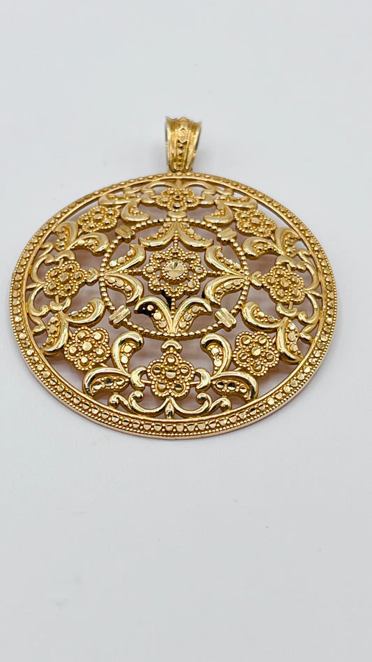 Vintage AE Designer 14K Solid Gold Pendant Floral Open Work Filigree Round