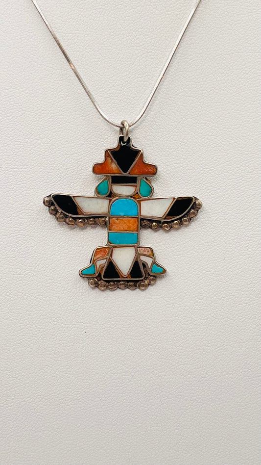 Vintage Zuni 925 Sterling Silver Turquoise Onyx Coral Inlay KnifeWing Dancer Pendant
