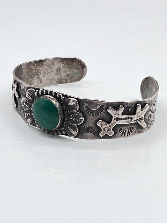 Vintage Native American Navajo Sterling Silver Cuff Bracelet Green Round Turquoise Stone Mirrored Animals