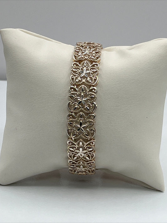 Sterling Silver 925 Wide Linked Filigree Bars Bracelet Open Work Light Gold Tone