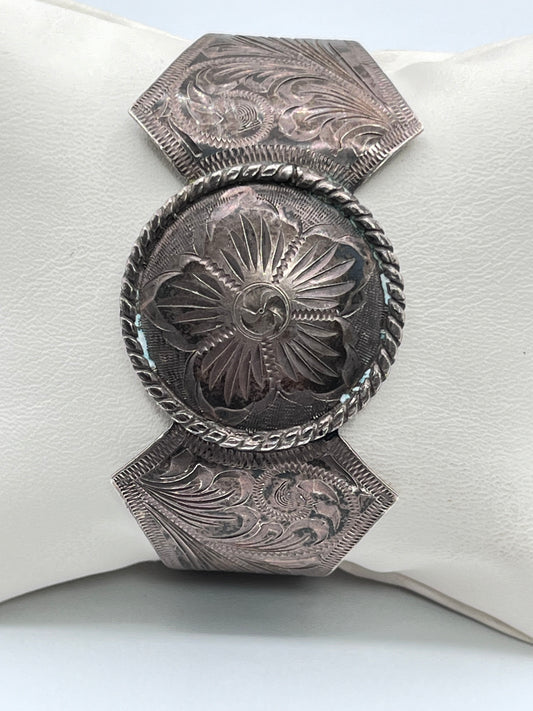 Vintage Mexico Designer 925 Sterling Silver Cuff Bracelet Engraved Floral Design Chunky RARE