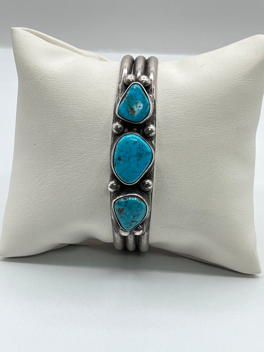 Vintage Native American Navajo Style Sterling Silver Cuff Bracelet Three Blue Turquoise Stones