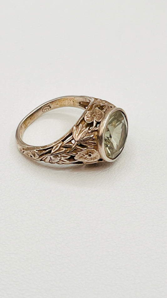 Vintage MSJ Designer 925 Sterling Silver Green Amethyst Ring Floral Design