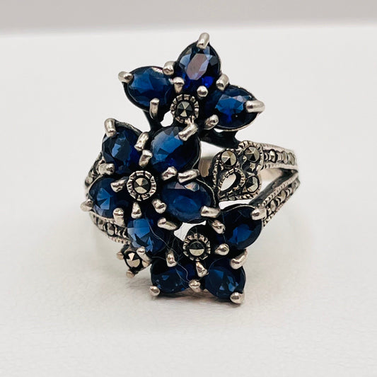 925 Sterling Silver Rare Royal Deep Blue Floral Ring