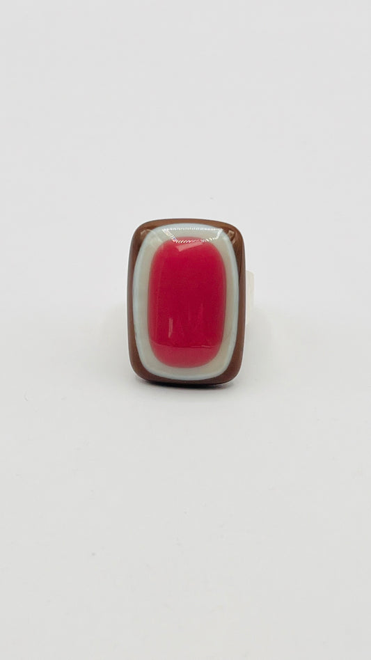 Vintage Delightful 925 Sterling Silver Pink Brown Ivory Rectangular Glass Chunky Ring