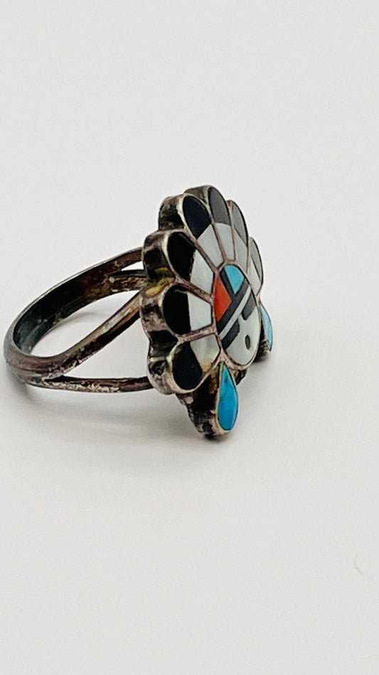 Zuni 925 Sterling Silver Sunface Kachina Mask Coral Turquoise Onyx Mother Of Pearl MOP Ring